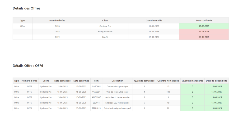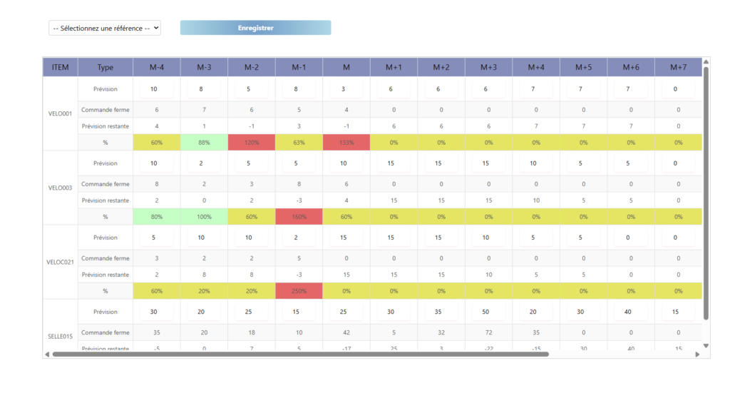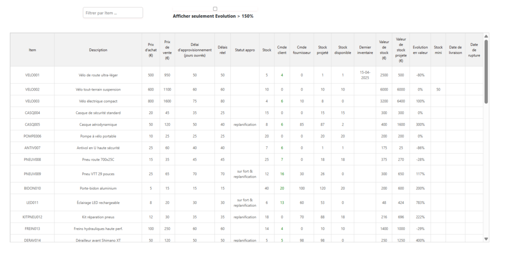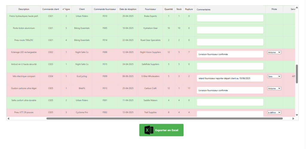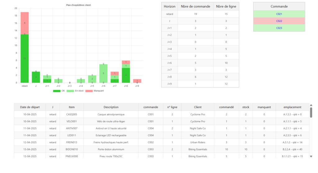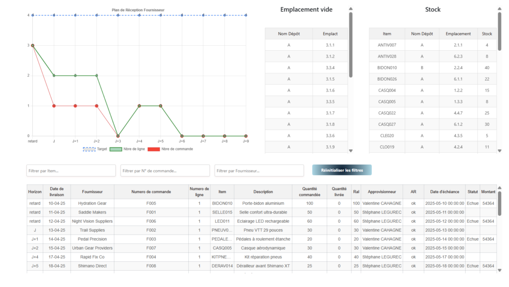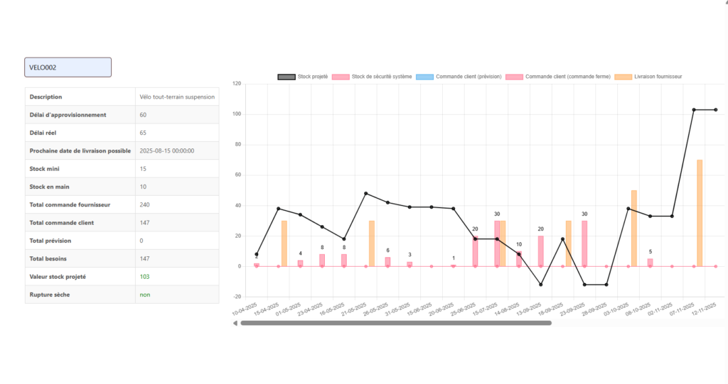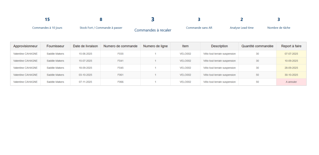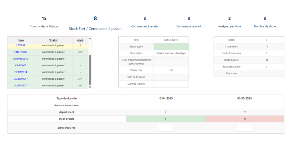 Visualise les stocks projetés, signale les commandes fournisseurs à replannifier, compare lead time réel vs système et alerte l’équipe pour passer les commandes au moment optimal, tout en montrant instantanément l’impact de chaque commande sur le stock.